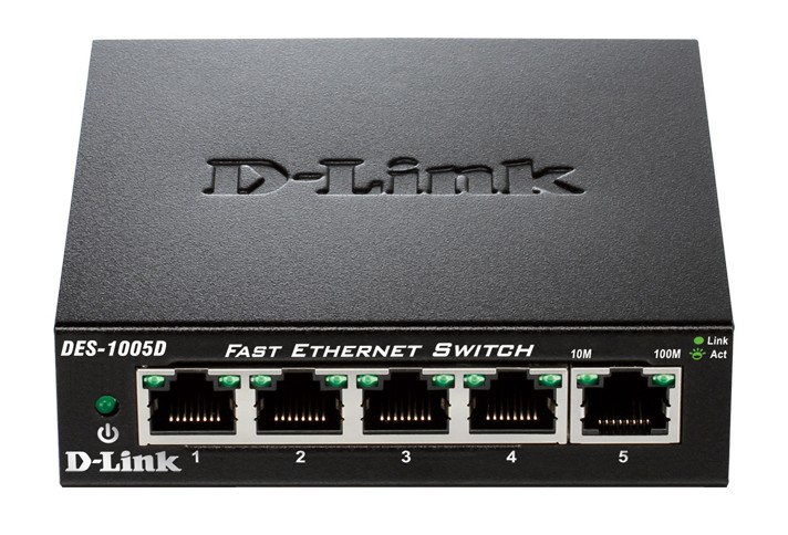 Неуправляемый настольный коммутатор Fast/Gigabit Ethernet D-Link DES-1005D с 5 портами 10/100Base-TX в металлическом корпусе для дома и небольших офисов с автоопределением скорости.
