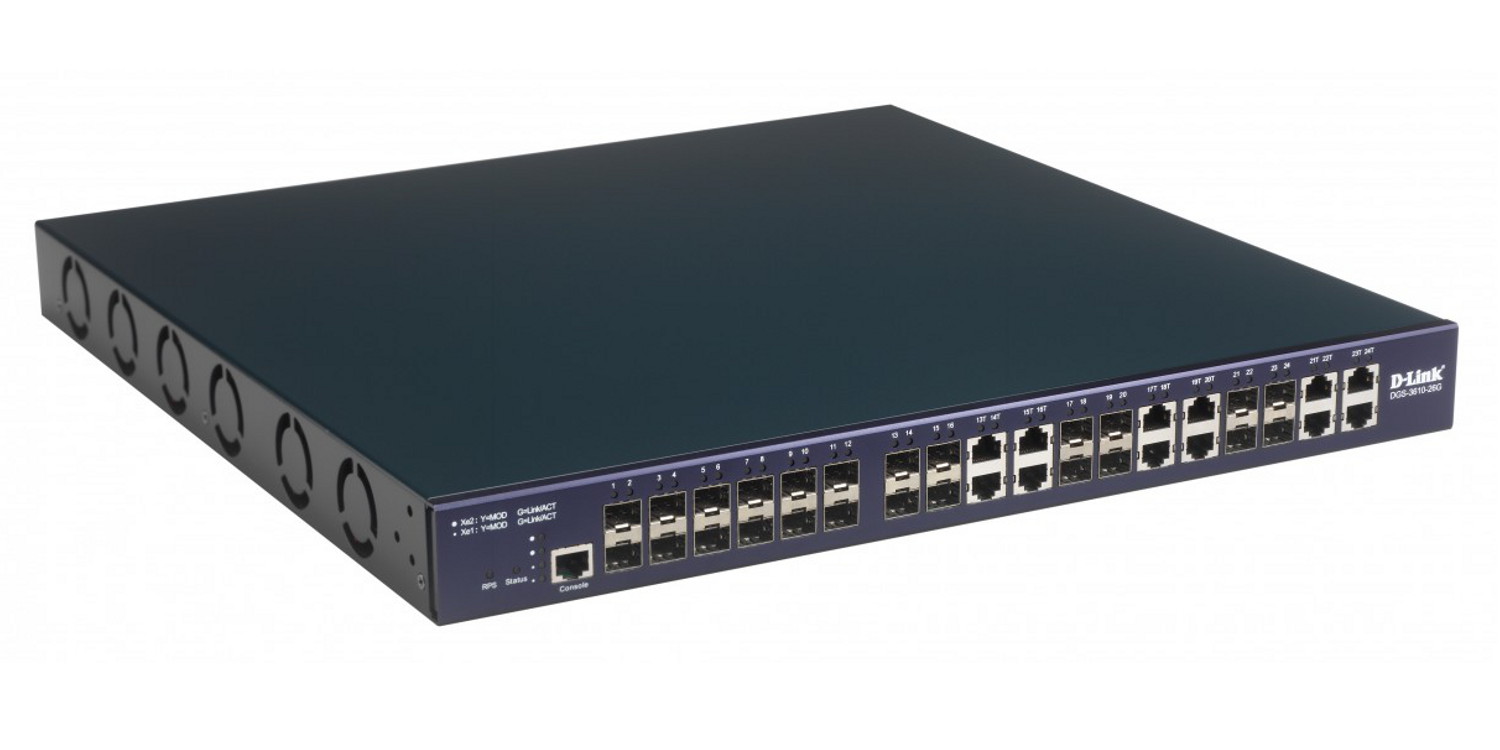 Управляемый коммутатор 3 уровня D-Link DGS-3610-26G с 12 портами SFP Gigabit Ethernet + 12 комбо-портами 10/100/1000Base-T/SFP + 2 слотами расширения.