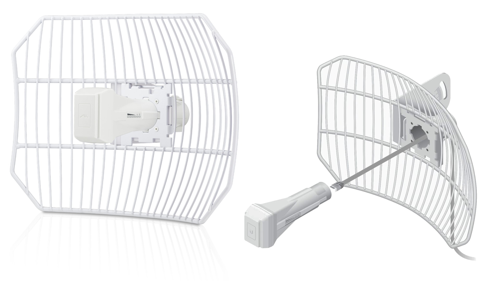 Антенна с коэффициентом усиления 20 dBi выполнена в виде решетки, что позволяет устройству противостоять сильным порывам ветра, отлично подходит для размещения на высоких мачтах.