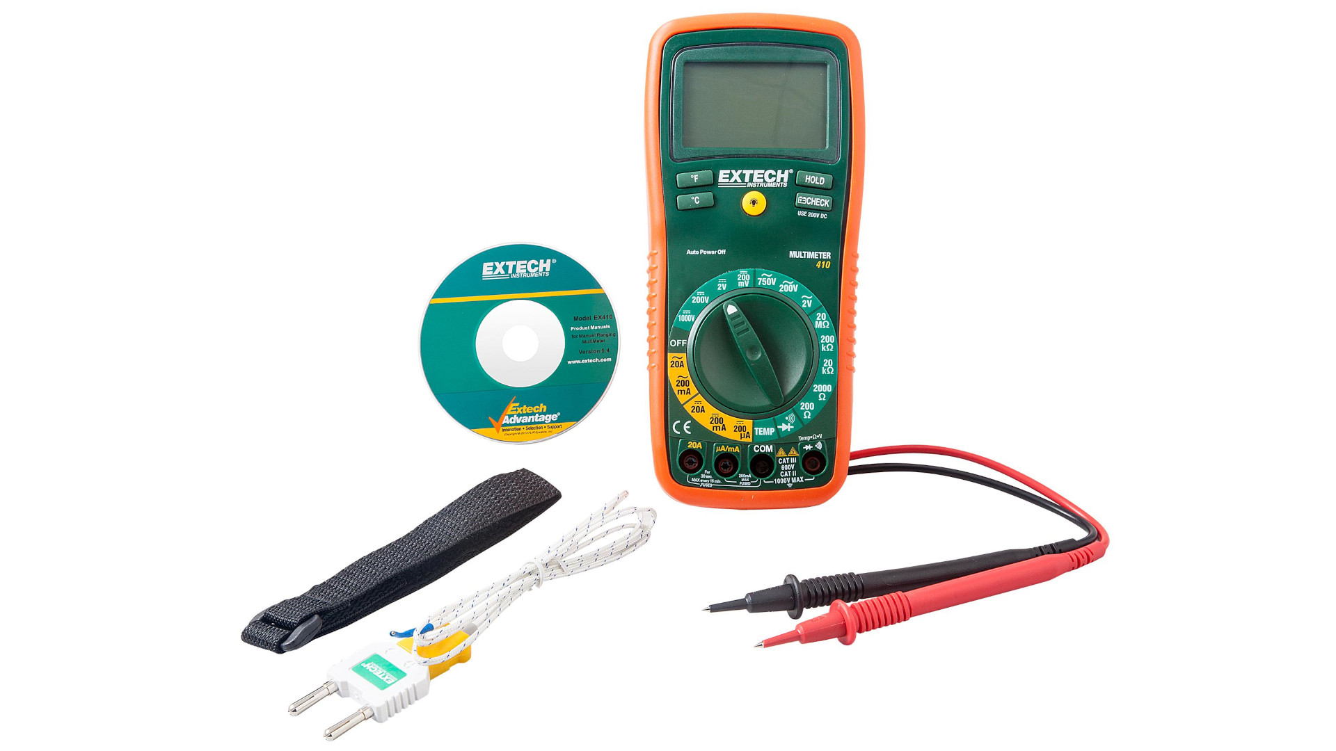 Цифровой мультиметр EX410A с возможностью измерения температуры термопарой тип К, и ручным выбором диапазона.