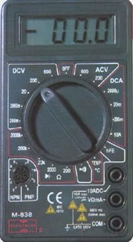Цифровой мультиметр Mastech M838 производит измерения силы постоянного и переменного тока, сопротивления, величины постоянного и переменного напряжения, и коэффициент усиления биполярных транзисторов (h21). Качество соединения проводников или пайки можно проверить с помощью звуковой прозвонки. Встроенный генератор синусоидального сигнала 1000 Гц будет полезен при испытании радиотехнических устройств. Так же с помощью мультиметра M838 можно прозвонить полупроводниковые диоды. Результаты измерений выводятся на хорошо читаемый цифровой 31/2 -разрядный ЖК-дисплей. Питание мультиметра осуществляется от одной батареи 9В типа "Крона". В комплекте поставки мультиметра Mastech M838 входит комплект щупов и инструкция на русском языке.