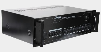 Микшер-усилитель предназначен для построения многозоновых систем оповещения и музыкальной трансляции. В устройстве предусмотрены кнопочный селектор на 4 зоны, 5 микрофонных входов (первый микрофон является приоритетным), 3 линейных входа (CD, Tuner, MP3), 2 линейных выхода (для записи и универсальный), 3-полосный эквалайзер для каждого входа, светодиодные индикаторы уровня выходного сигнала.
