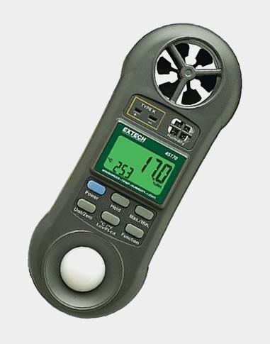 Прибор Extech 45170 для измерения влажности, температуры, скорости движения воздуха, освещенности обладает большим двойным дисплеем для удобного, одновременного отображения измеренных показаний. К прибору может подключаться термопара типа К (опция) для измерения температуры обьектов контактным методом.